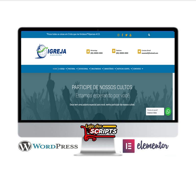Site para Igrejas Evangélicas super completo com painel administrativo bem fácil e bem simples, 100% responsivo criado em plataforma WordPress modificado, sistema Elementor com arrasta e solta, acompanha vídeo aula de instalação passo a passo, e ainda daremos total suporte durante a instalação, agora você vai ter o site de sua igreja de forma bem simples e bem profissional, A entrega do script é automática, comprou ja baixa na hora pois nosso sistema de entrega é automático, bastando apenas entrar em sua conta em nossa loja e ja baixar o arquivo e as video aulas de instalação.